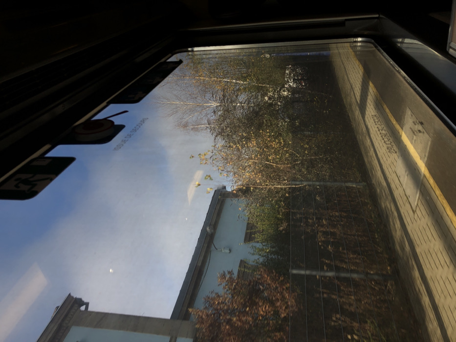 The image depicts a static scene observed from inside a train, looking out a window at a railway environment in Vendenheim, France. The upper portion of the frame shows a clear blue sky with minimal cloud cover. On the left, a portion of a light blue building with a dark roofline and an ornate cornice is visible. Below the building, and extending across the mid-ground, is a dense growth of trees and bushes, displaying autumnal colors of brown, yellow, and green, interspersed with several bare deciduous trees. A metal wire fence runs horizontally across the scene, separating the vegetation from the foreground. The foreground features a paved railway platform constructed from light-colored interlocking pavers, with a prominent yellow line running parallel to the tracks. Reflections on the train window obscure parts of the view and show interior elements, including a horizontally flipped "ISSUE DE SECOURS" (Emergency Exit) text, a green emergency exit pictogram of a running person, and a red circular symbol with a white line. No individuals are present in the scene.