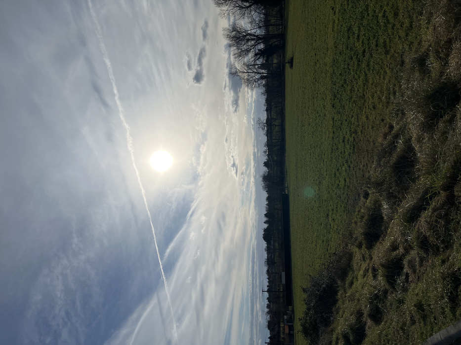 The image displays an expansive outdoor scene in Saint-Galmier, France, under a partially cloudy sky. The bright, circular sun is situated in the upper right quadrant, producing a strong glare and a green lens flare artifact centrally within the midground field. The sky features widespread cirrus clouds and a distinct, linear aircraft contrail traversing diagonally from the upper left, passing near the sun, towards the mid-right. A secondary, fainter contrail is visible in the upper left. The immediate foreground, spanning the lower left, consists of a steep, irregular grassy embankment covered with a mix of dried, matted brown and greener grass. A dark, dense shrub or bush is located at the lower left edge. This embankment transitions into a large, flat, uniformly green grassy field that dominates the midground. A small, indistinct dark clump of vegetation or debris is present within this field, towards the right side. Along the horizon, a sparse line of leafless deciduous trees is visible, partially silhouetted against the sky. Behind these trees, elements of a distant settlement are discernible, including utility poles with overhead wires and indistinct building structures. A dark, linear boundary, possibly a fence or hedgerow, runs horizontally behind the grassy field, separating it from the distant trees and structures. No individuals or specific actions are identifiable within the frame.