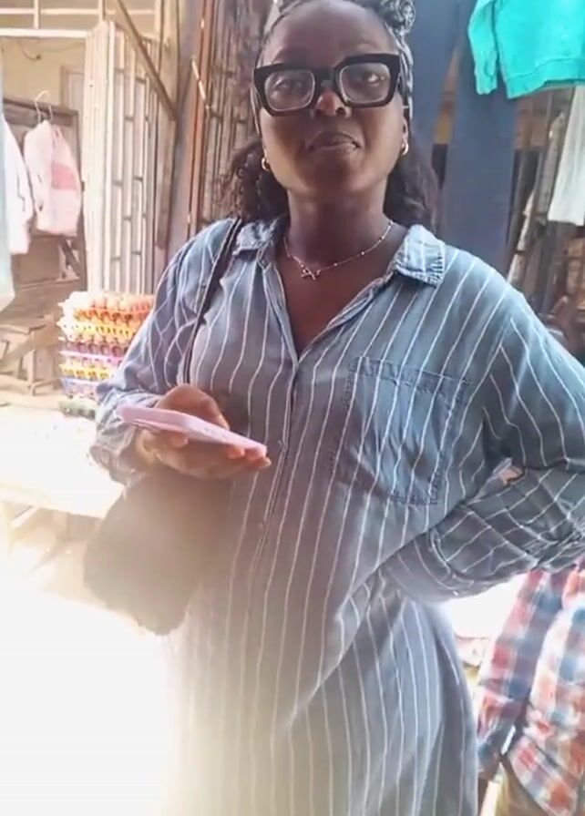 A woman with dark skin is standing in a market area. She is wearing glasses, a blue and white striped shirt, and a patterned head wrap. She also has a purse slung over her shoulder. She is looking at her phone, which she holds in her right hand. To her left is a stack of cartons of eggs and some other goods on a table. Behind her, partially obscured, is a person in a plaid shirt. The setting appears to be a somewhat crowded marketplace.