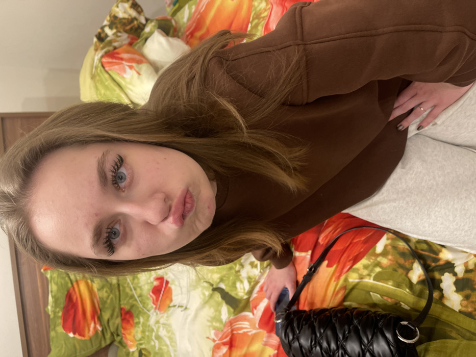 A young woman with blonde hair and long eyelashes poses with pursed lips. She wears a brown sweater and grey sweatpants. The background consists of a colorful floral patterned bedspread. A black quilted handbag with a silver ring detail rests on the bed next to her. Her left hand is visible on her chest, adorned with a ring and dark nail polish.