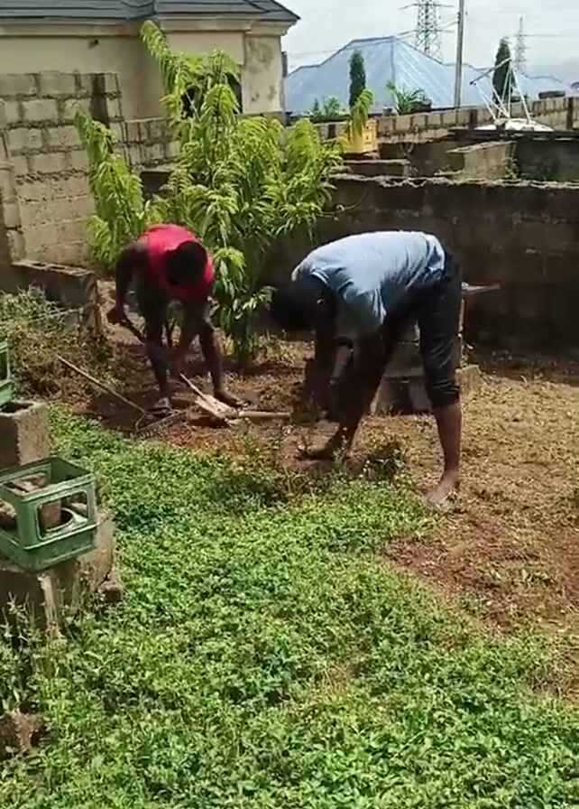 Two individuals are clearing a yard or garden area. One person is wearing a red shirt and dark shorts and is using a garden hoe. The other person is wearing a light blue shirt and dark shorts and is using a hand tool that appears to be a small shovel. Both individuals are bending over, working on the ground to remove weeds and other vegetation. The area they are clearing is a mix of bare dirt and patches of green ground cover. In the foreground, there is a patch of dense, low-lying green plants. A green crate sits on the left side. The background shows a residential area with houses, trees, and utility poles. The sky is overcast, suggesting a cloudy day.