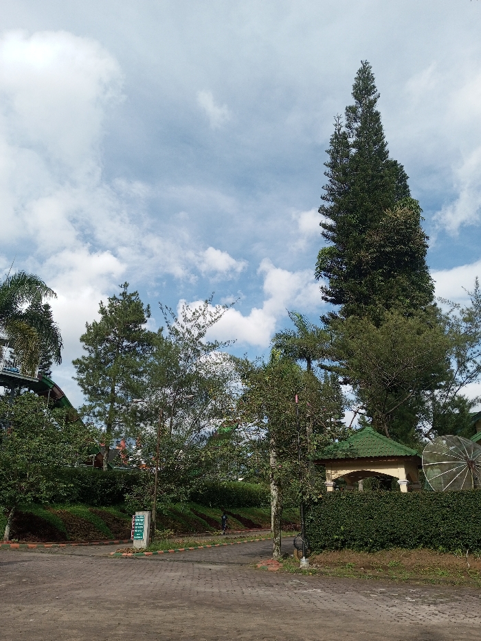 A partly cloudy sky looms over a landscape filled with lush greenery and various trees, including a towering conifer. A paved pathway leads through the scene, bordered by hedges and a small building with a green roof. A satellite dish is visible near the building, and glimpses of structures can be seen amid the dense foliage. The overall impression is one of a tranquil park or garden setting.