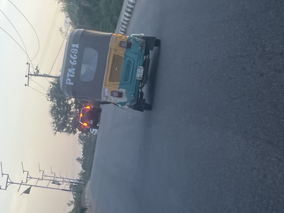 This image depicts a road scene in the city of Gura Top, Nigeria, at what appears to be dawn or dusk under a hazy sky. The primary subject is a three-wheeled auto-rickshaw, painted dark grey, yellow, and light blue/green, positioned in the middle-right foreground, driving away from the viewer. The text "PTA-6681" is visible in white on its rear, and a license plate reading "ABV-437E" (partially obscured) is affixed below. Ahead of the auto-rickshaw, further down the road, a dark-colored SUV with illuminated red taillights is visible, followed by a smaller, lighter-colored vehicle. The road surface is asphalt. A striped white and black curb or barrier runs along the right side of the road. On the left side of the road, multiple street light poles with cross-arms extend into the distance, some bearing flags or banners. On the right, a utility pole with overhead power lines is present. The environment features green trees and bushes lining the roadside, with faint hills or mountains visible in the distant background. No individuals are explicitly discernible in the image, though the vehicles are in motion.