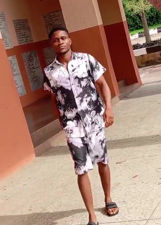 young man standing outside a building. He is wearing a matching black, white, and gray patterned shirt and shorts, and black sandals. He walks forward and looks directly at the camera. The building behind him is mostly a light peach color, with a dark reddish-brown trim. There are multiple plaques mounted on the peach part of the wall. The ground is a light speckled beige color. In the background, some trees and greenery are visible. The lighting suggests it is daytime.