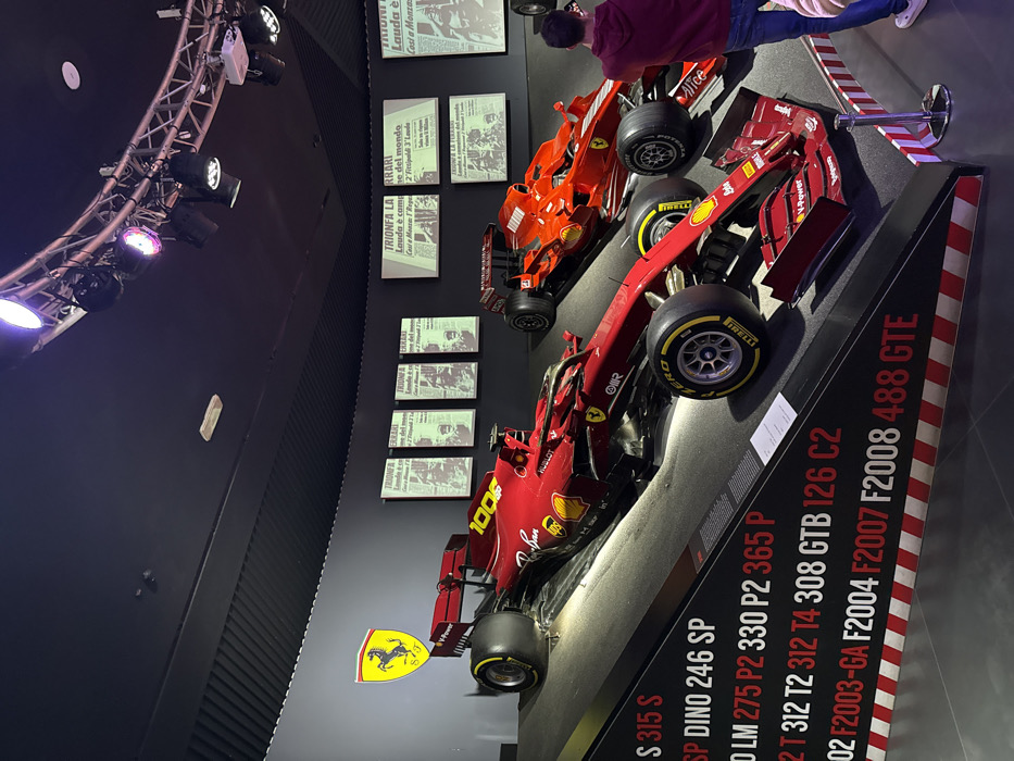 The image depicts an interior view of the Museo Ferrari in Maranello, Italy