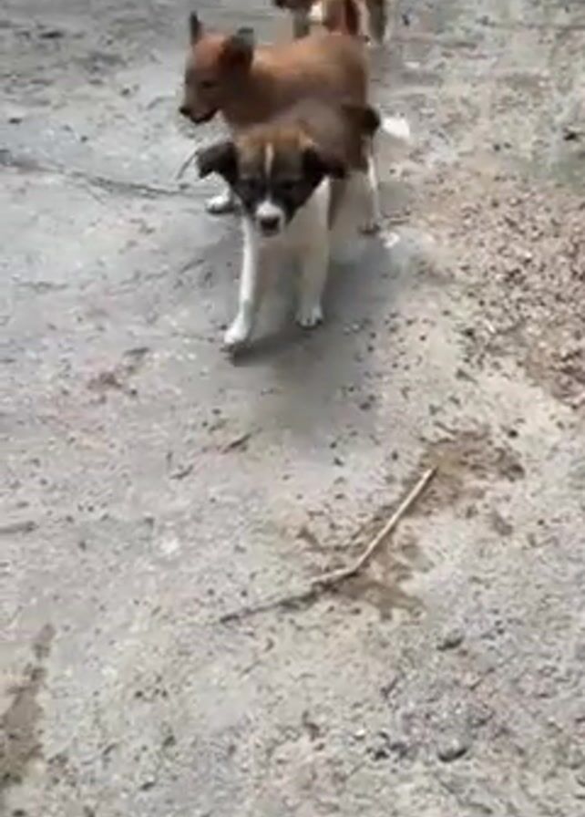 Three young puppies are shown on a grey concrete slab that appears to be outdoors. The puppy in the foreground is brown and white, while the other two are tan. The puppies all look directly at the camera and start to walk towards it. As they approach, they begin to move around each other. One of the tan puppies briefly stands up on its hind legs on top of the brown and white puppy.