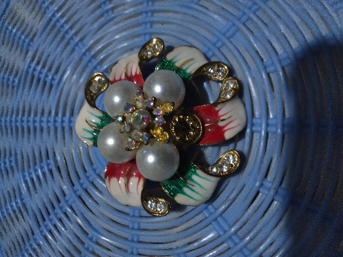 A single, ornate floral-patterned brooch is centrally depicted against a light blue, woven, textured surface. The brooch, approximately 5-6 cm in diameter, features a gold-toned metal base with enameled petals in red, white, and green. The white enamel exhibits fine red striations, and the green enamel shows white striations. Four large, spherical, off-white imitation pearls, each approximately 1.5 cm in diameter, are arranged around a central cluster of smaller, multi-faceted, iridescent rhinestones. Eight additional smaller clusters of clear rhinestones, set in gold-toned teardrop-shaped frames, are positioned between the enamel petals. The background surface is a synthetic woven material, possibly plastic wicker, characterized by concentric circular ridges and radial spokes. Subtle shadows are cast to the lower right of the brooch. No individuals, actions, or specific interactions are present. The precise location within Ghent, Belgium, cannot be identified from the visual data provided.