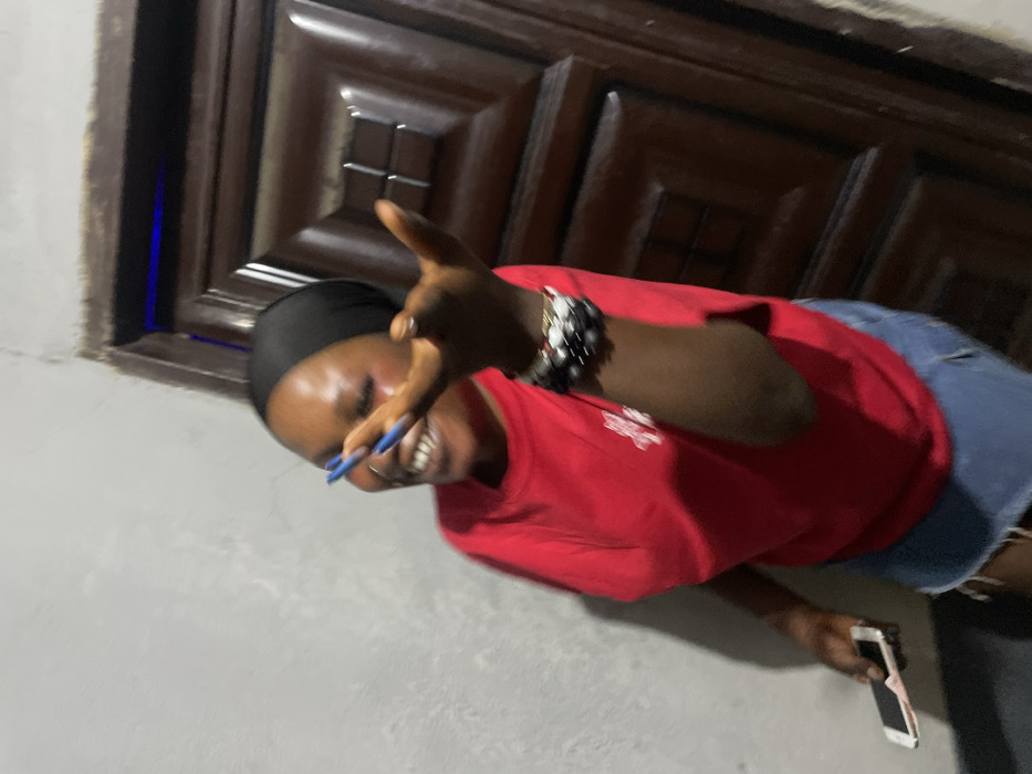 A woman with a black head covering, wearing a red shirt, is seen angled in the frame, against a backdrop of a wall and a wooden door. Her left hand is raised, gesturing with two fingers, while her right hand holds a smartphone. She is also wearing a bracelet. The woman is smiling and her long blue nails are visible. She also appears to be wearing a jean skirt.