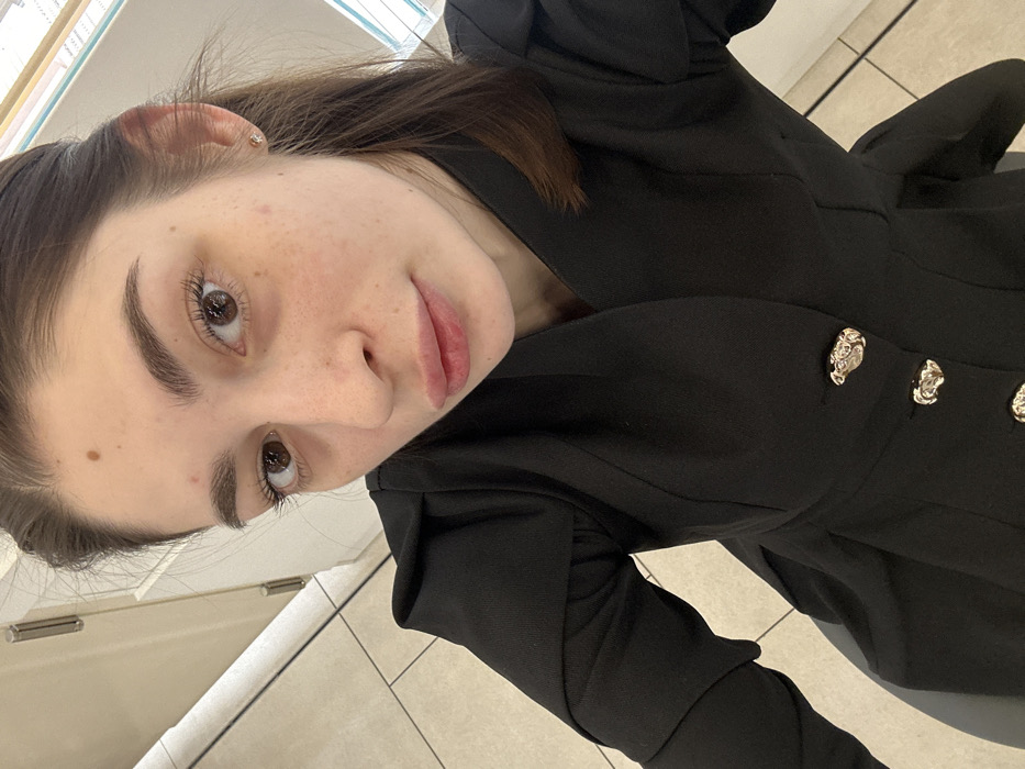 The image displays a close-up, slightly high-angle view of a female subject, estimated to be in her 20s to early 30s, within an indoor environment in the city of Yekaterinburg, Russia. The subject has light brown eyes, full lips, and dark brown hair that is partially pulled back. A distinct dark mole is present superior to her left eyebrow, and freckles are visible across her nose and cheeks. She is wearing a black blazer or jacket featuring a V-neckline and decorative gold-toned buttons with an irregular, textured surface. The sleeves exhibit a structured design at the shoulders. A small, clear stud earring is present in her right earlobe. The background, largely out of focus, reveals a light-colored wall with a metallic hinge component in the upper left, and square, light-toned floor tiles are visible in the lower left quadrant. The lighting indicates an indoor setting.