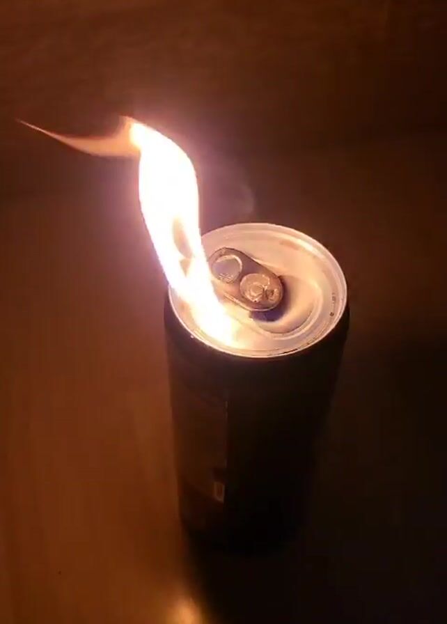 can of liquid on fire. The can is dark in color and features a silver pull-top lid with two openings. Flames are emerging from these openings, extending upwards and to the left. The can is positioned on a flat, reflective surface, possibly a wooden table or countertop. The background is dimly lit, suggesting a dark or indoor setting.