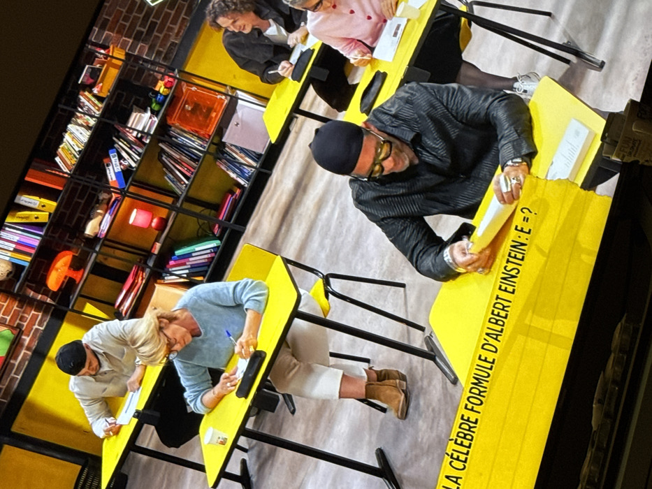 Four people are sitting at yellow desks, writing on papers. One man wears a black hat and leather jacket, deeply engrossed in his work. A blonde woman in a light blue shirt sits next to a man in a light jacket. An older woman in pink and another in black are at the first row. A bookshelf filled with items sits in the background. The yellow desks have the phrase "LA CÉLÈBRE FORMULE D'ALBERT EINSTEIN: E=?" written on them.