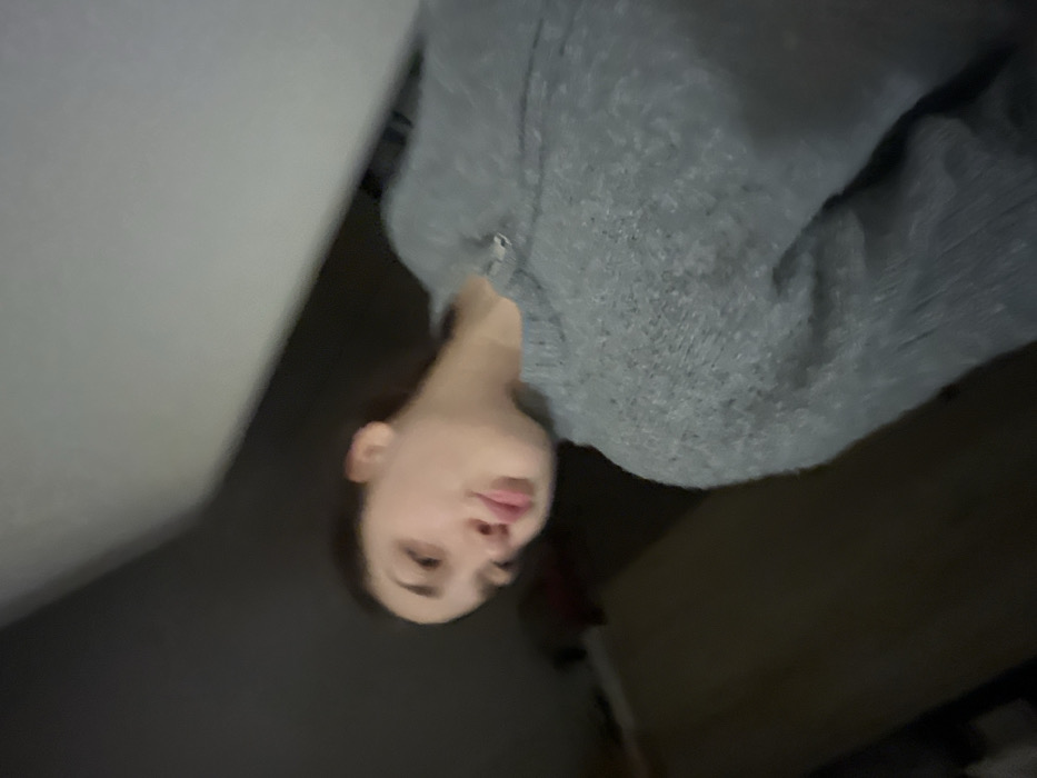 A person wearing a gray sweatshirt looks at the camera. The image is upside down and the lighting is dim. A white wall is visible on the left and a dark brown shelf is visible on the right. The background is dark. The person has fair skin, dark hair, and appears to be indoors.