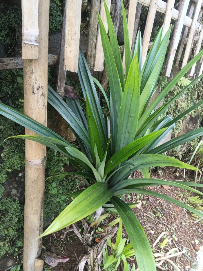 A vibrant green Pandan plant thrives beside a simple bamboo fence