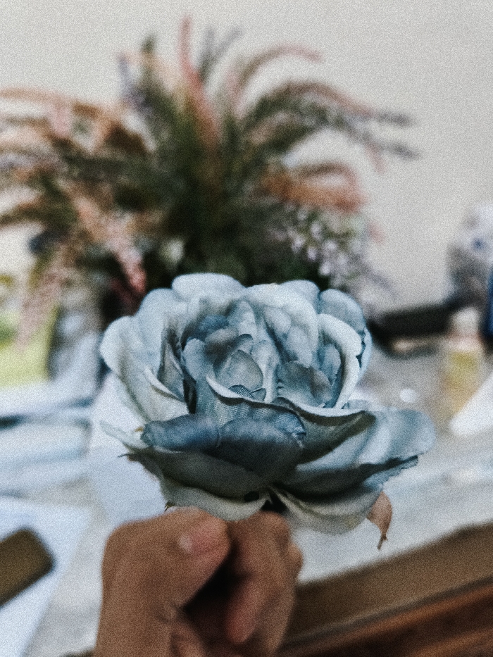 The image presents a human hand holding a single artificial rose in an indoor environment in Lhokseumawe, Indonesia. The hand, visible in the lower center, has a light brown skin tone and firmly grasps the stem of the rose. The artificial rose, the primary focal point, is constructed from textile material, featuring multiple layers of blue-grey petals with distinct textural folds. The background is intentionally blurred, revealing an indistinct arrangement of dark green foliage with reddish-brown tips, consistent with a decorative plant or floral display. Other amorphous light-colored objects and surfaces are visible in the highly diffused background. A dark, horizontal wooden surface is discernible in the lower right portion of the frame. The entire image exhibits a pervasive grainy texture.