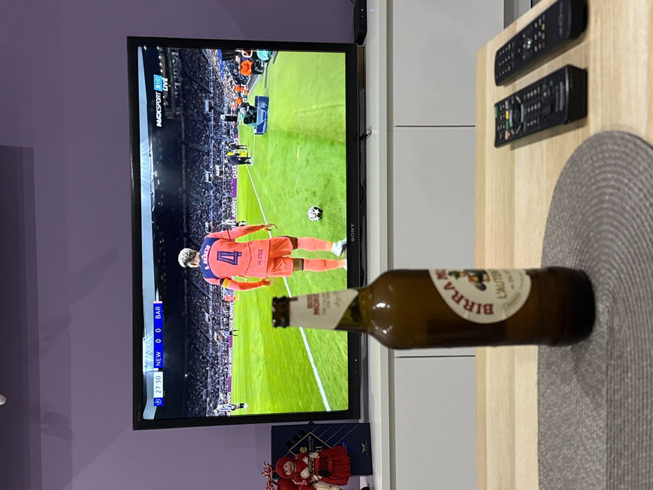 The scene depicts an interior view of what appears to be a private residence in Sofia, Bulgaria. A large, black-framed Sony flat-screen television is centered, displaying a live football match from the "MAXSPORT HD LIVE" channel. The on-screen graphic shows "27:30 NEW 0 0 BAR." A male football player, identified as R. ARAUJO, wearing an orange jersey with the number 4, is visible from behind on the green pitch, with a football near his feet. Spectators are visible in the stadium background. In the immediate foreground, on a light-colored wooden table, a partially full, chilled brown glass bottle of "BIRRA MORETTI L'AUTENTICA" beer rests on a gray, woven placemat. To the right of the beer bottle, two black remote controls are present. A white television console is positioned directly beneath the screen. On the console's left side, a small red and white folk doll and a dark blue decorative box are visible. The room's walls are painted a light purple.