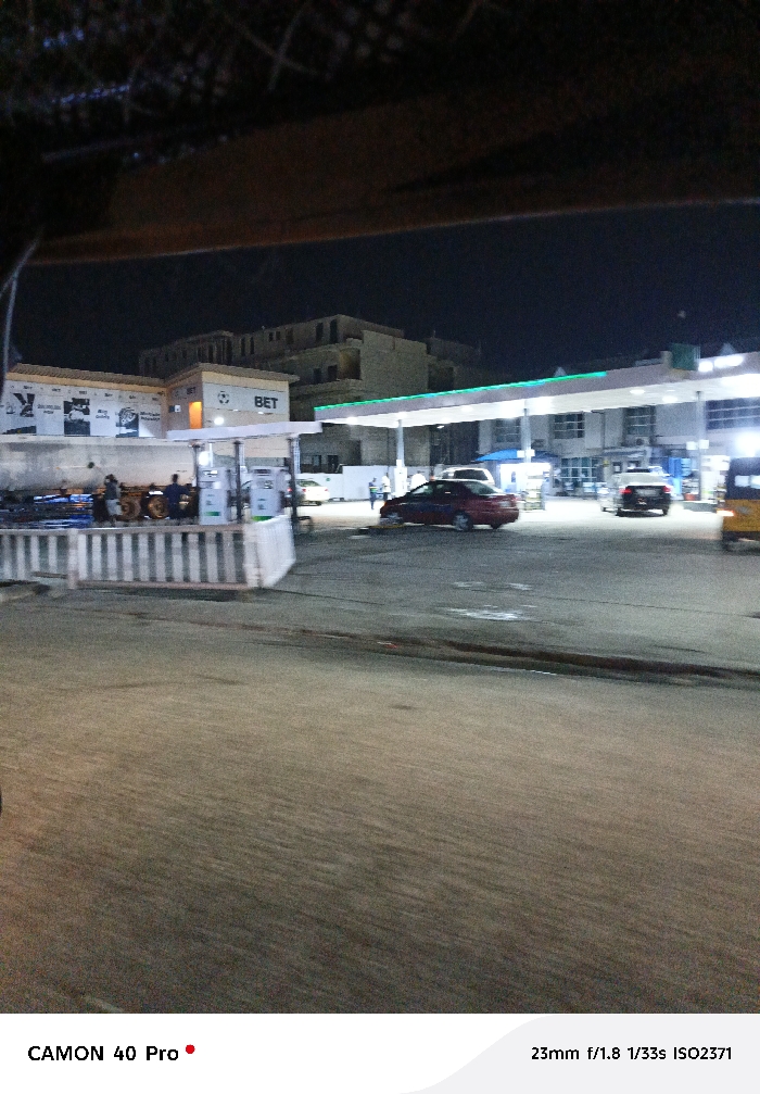 An outdoor scene at night features a gas station with multiple pumps under a brightly lit canopy. Several cars are present, including a red sedan and a yellow tuk-tuk. In the background, buildings rise above the gas station, with one displaying the word "BET." A fence borders the area in the foreground, and the ground appears paved and slightly wet. The overall lighting is a mix of artificial lights from the gas station and buildings, illuminating the scene in a somewhat blurred fashion.