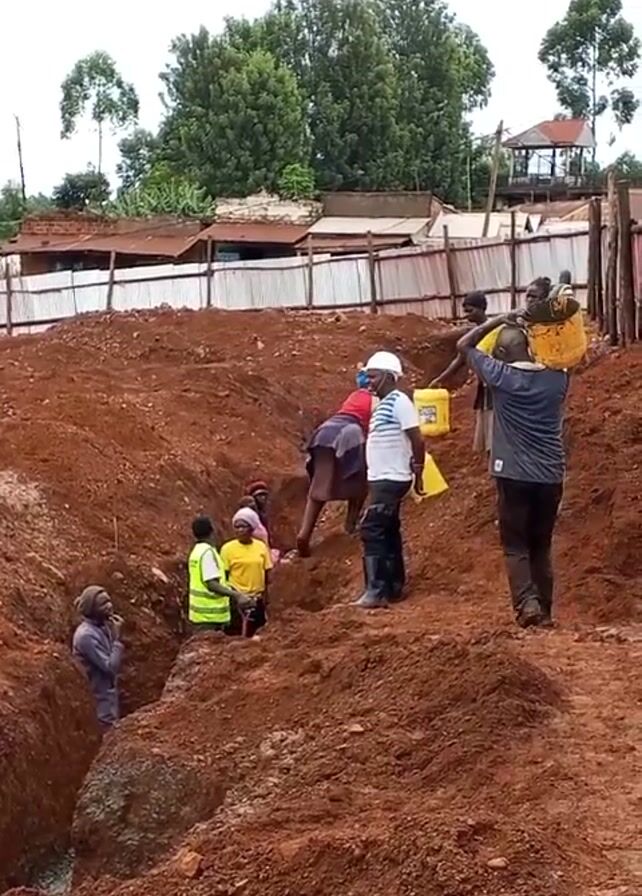 group of people working at a construction site. The ground is red clay. There is an excavation in the foreground where some people are standing. Other people are carrying yellow containers of liquid up a slope. A man in a white hard hat and striped shirt seems to be supervising. Some buildings and trees are visible in the background under an overcast sky. There is a fence separating the construction site from the buildings. Some workers are wearing bright yellow safety vests. One person is wearing a red hard hat.