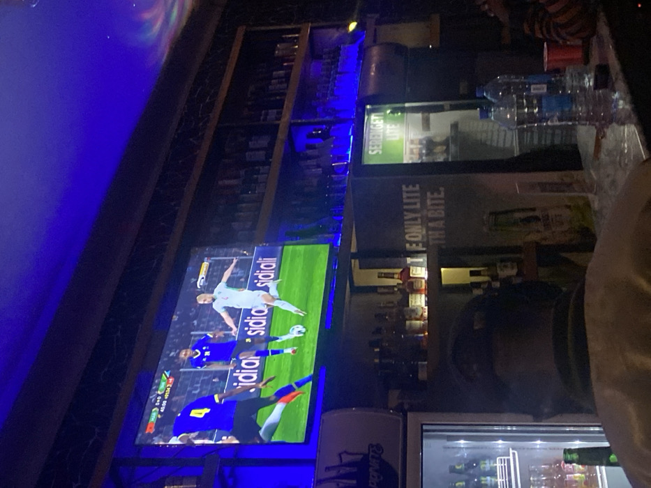 bar in Mbinga, Tanzania (coordinates -10.947, 34.997), where people are watching a soccer game on a large screen television mounted above a bar counter. There are several bottles of liquor on shelves behind the counter. The TV shows a live match between two teams, one in blue and white, the other in red and white. One player from the blue and white team is in the middle of a kick, with the ball in front of him. Another player in blue and white is running on the left side of the screen. The bar itself appears to have an unfinished look, with exposed wiring and dark walls. The image was taken in a dimly lit environment, with blue lights illuminating the counter. A man with headphones is sitting at the bar, watching the game on the screen. He is wearing a dark jacket and a light shirt. A red cup and two water bottles are on the counter. The sign "THE ONLY LITE WITH A BITE" is visible on the bar, along with a sign that says "SERENGETI LITE." The bar is a lively place, with the game providing entertainment and a sense of community.