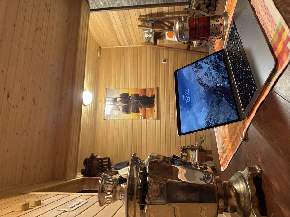 This image captures an interior scene within a structure located in Капцёўскі сельскі Савет, Belarus. The room features light-toned wooden plank paneling on the walls and ceiling, illuminated by a central, flush-mounted circular light fixture. On a dark wooden table in the foreground, a polished, brass-toned samovar occupies the left. To its right, an open silver MacBook Air laptop displays a lock screen featuring a mountainous landscape and the time '16:42'. Adjacent to the laptop on the right is a glass French press containing a reddish liquid. Both the laptop and French press rest on a multi-colored, patterned fabric placemat. In the background, a framed artwork depicting a sailing ship against an orange sky is mounted on the wooden wall. To the far right, a section of wall exhibits a stacked stone or brick facade, with a pile of firewood and a small, rustic wooden shelving unit holding various items positioned nearby. No human presence is observed.