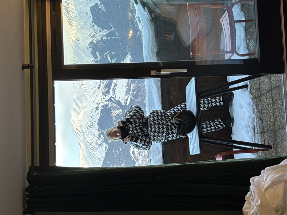 Through a large window with snow-capped mountains, a woman in a houndstooth coat stands on a stool. She has blonde hair and is wearing black boots with a matching pattern. A black hat rests on the stool. Outside, snow covers the balcony and parts of nearby chairs. Indoors, dark green curtains hang above a partially visible white towel.