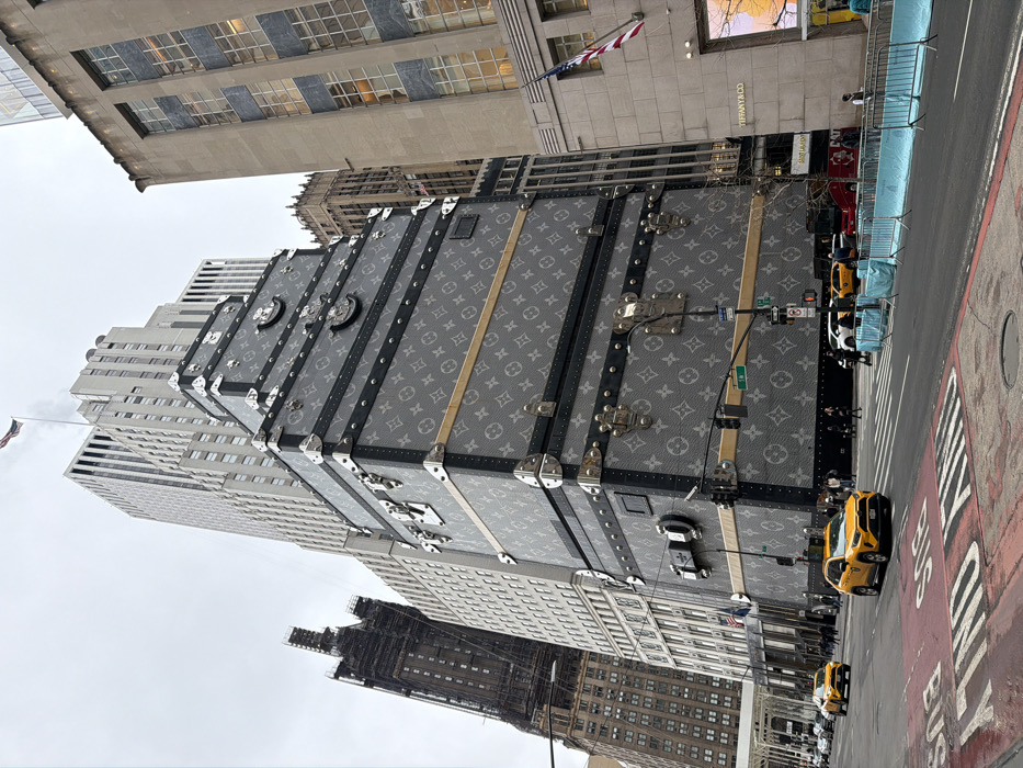 The image displays an urban street scene at the intersection of 57th Street and Fifth Avenue in Midtown Manhattan, New York City. A multi-story art installation, constructed to resemble five stacked Louis Vuitton trunks of decreasing size, dominates the left side of the frame, affixed to a building corner. The trunks are grey with a subtle Louis Vuitton monogram pattern, accented by black trim, silver-toned hardware including corner protectors, clasps, studs, and handles, and light brown horizontal banding. To the right of the trunks, the beige stone facade of the Tiffany & Co. building is visible, featuring large windows, the "TIFFANY & CO." signage, and an American flag flying from a pole. In the background, multiple skyscrapers rise, including a light-colored building directly behind the trunk installation and a darker building to the far left that appears to be under construction or renovation, partially covered in scaffolding. The street in the foreground is asphalt, marked with prominent red "BUS ONLY" and "ONLY" text and white crosswalk lines. Several yellow New York City taxis are present on the street; one is prominently featured driving towards the viewer in the left lane, and others are further down the street. Pedestrians are visible on sidewalks and crossing the street in the middle ground. Blue temporary barricades line the right edge of the street. The sky is overcast.