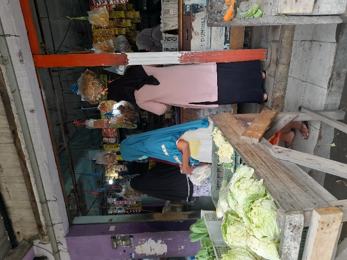 Two women in headscarves are browsing merchandise at a storefront. One wears a light pink dress over a black skirt, while the other is in blue. The shop displays food items, some in bags hanging from the ceiling. A wooden table filled with green vegetables, like cabbage, stands outside the shop. A "DUNHILL" branded item is visible in the background. The storefront has a painted purple section with peeling paint.