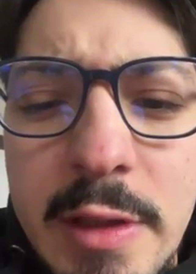 man's face in close-up. He has dark hair, a mustache, and is wearing glasses with dark frames. His facial expression is neutral, and he appears to be looking slightly downward. The background is a plain, light color, and the lighting is even. The man's face is the primary focus of the video.