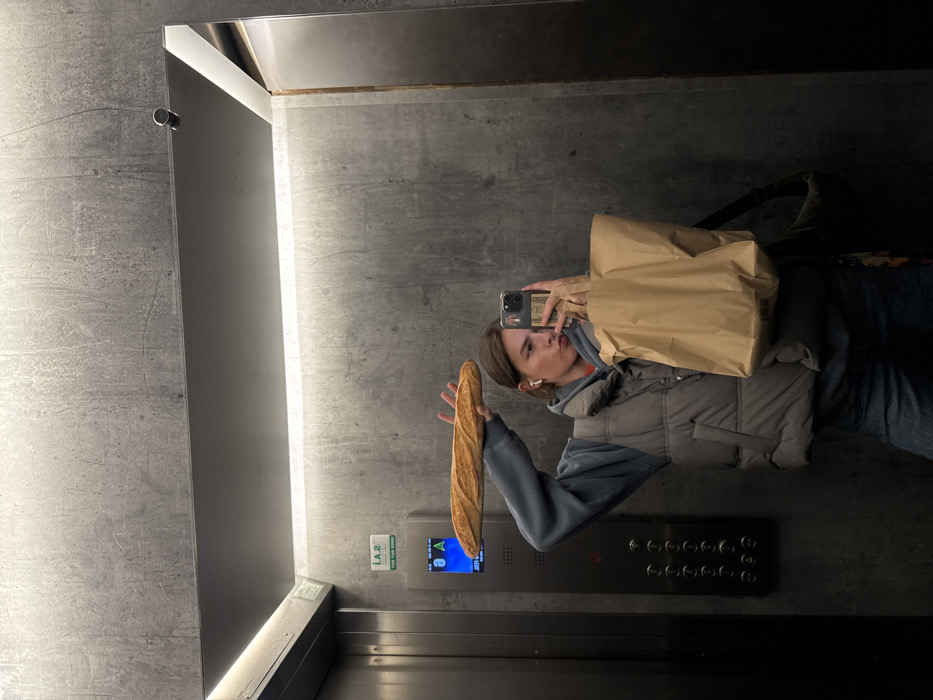 This image depicts an individual taking a selfie inside an elevator. The elevator walls are covered in a textured, dark grey material, and a horizontal strip light illuminates the ceiling. On the left wall, a metallic control panel features a digital display showing blue text and multiple circular buttons. Above the control panel, a small green sign reads "I.A.S 105 106 000." This identifier indicates the elevator's location is within a building in Strasbourg, France. The subject, a young adult appearing female, is centered in the frame, reflected in a mirror on the right side of the elevator. They are wearing a grey puffer vest over a blue long-sleeved top and dark blue jeans. White wireless earbuds are visible in both ears. With their right hand, they hold a smartphone, positioned to capture their reflection. Their left arm is raised, holding a golden-brown baguette horizontally above their head. A large, light brown paper shopping bag is held by their left hand, hanging in front of their chest. A dark strap from another bag is visible over their left shoulder. The subject's lips are slightly pursed in a pouting expression as they pose for the photograph.