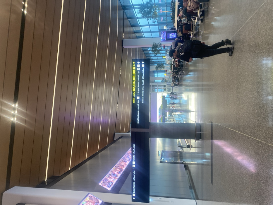 - "An airport terminal interior features prominent signage indicating directions to "Toilets," "Quiet Rooms," "Gates D2, D4, D6, D8," "Smoking Room," "Prayer Rooms," and "Service Animal Area" in both English and Arabic" by FM-ikS7J2, licensed under CC BY 4.0