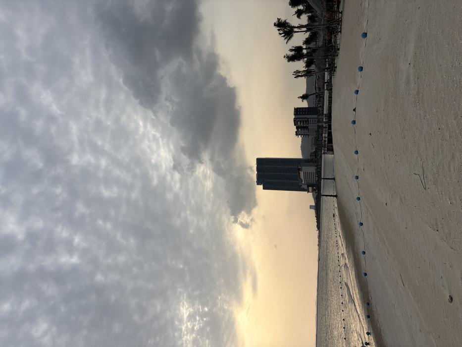 This image displays a coastal scene in Bai Chay Ward, Vietnam, under a heavily overcast sky with varying shades of grey clouds. A lighter, yellowish-orange glow is visible on the horizon towards the left. The foreground consists of a wide expanse of light-colored sand. To the left, the calm water of a bay or ocean meets the shore. A series of approximately fourteen blue spherical buoys, connected by a rope, extends along the waterline, demarcating an area in the water. One dark, partially submerged human figure is discernible in the water near the leftmost buoys. The mid-ground on the right features several dark palm trees with associated thatched-roof structures, and dark, elongated wooden structures that appear to be jetties or piers extending towards the water. The background reveals an urbanized coastline, prominently featuring two tall, dark-colored high-rise buildings positioned centrally. Additional multi-story buildings are visible to the right of these structures, with distant hills silhouetted behind them. No other individuals are clearly visible on the beach or adjacent areas.
