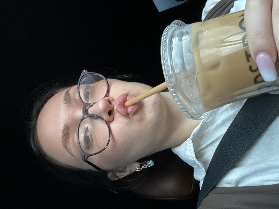 A female adult is depicted in a close-up, chest-up shot, situated within a vehicle in Las Vegas, United States. She wears dark-framed glasses, a light-colored collared shirt, and a dark seatbelt across her chest. Her left ear features a hoop earring with two dangling square, clear charms. She holds a clear plastic cup containing an iced, light brown beverage with ice cubes and a brown straw. Her lips are pursed around the straw, suggesting she is actively drinking. Her right hand, featuring nails with a pink-to-white ombré manicure, grips the cup, which displays a partial logo that appears to read "OSTRO." A dark brown car seat headrest is visible behind her, with the remainder of the vehicle interior appearing dark.