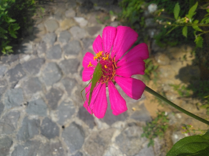 A magenta Zinnia flower is prominently featured in the foreground, with a pale green, grasshopper-like insect resting on its yellow-orange central disc florets
