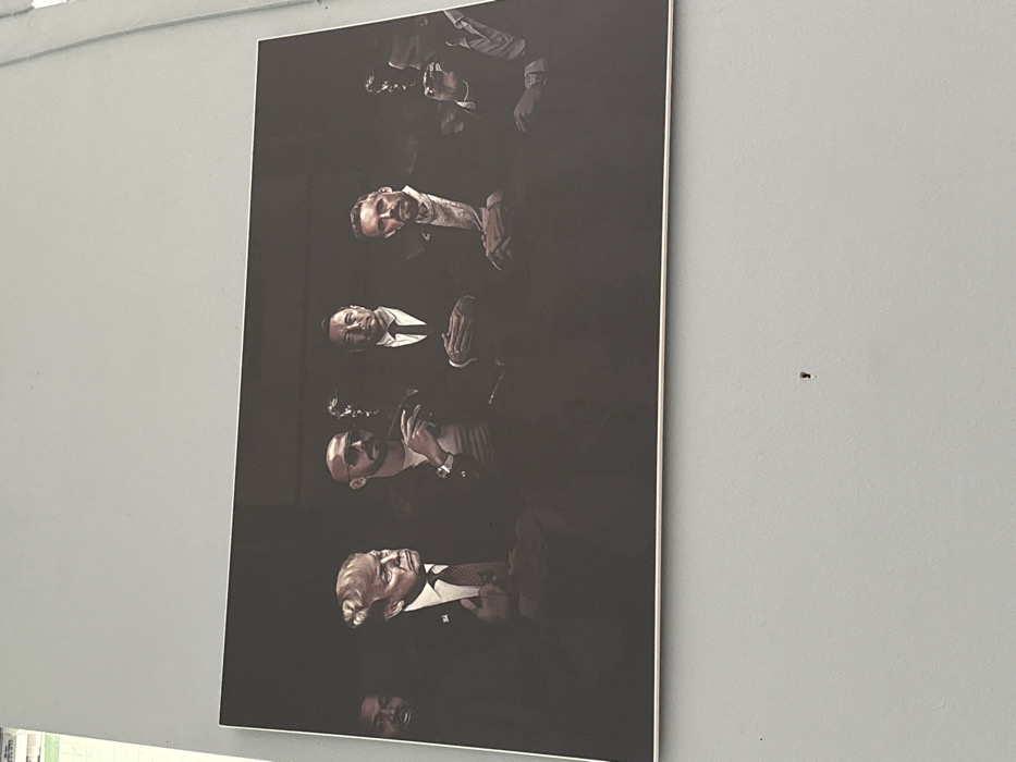 A large, rectangular print is affixed to a light grey, uniformly painted wall in Sofia, Bulgaria. The print features a composite dark-toned portrait of six prominent male figures arranged in a group, seated or standing, against a deep black background. From left to right, the identifiable subjects are: a partially visible male, Kanye West, in dark attire; Donald Trump, wearing a dark suit and red tie; Andrew Tate, bald, wearing sunglasses and a light shirt, holding a cigar in his right hand with a watch visible on his left wrist; Elon Musk, dressed in a dark suit and tie with his hands clasped; and Jordan Peterson, with a beard, wearing a patterned shirt under a dark suit, also with his hands clasped. On the far right, a partially visible bearded male figure, also in dark attire, holds an object, likely a cigar or drink, to his mouth. All figures display serious or contemplative expressions, looking generally towards the viewer. A small, dark, irregular indentation or hole is present on the wall surface directly below the center of the print.