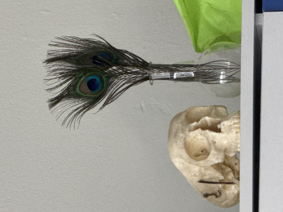 The image displays an indoor scene in Pernik, Bulgaria, featuring a curated arrangement of objects atop a white horizontal surface. On the left, a light-colored animal skull specimen is positioned, presenting a prominent orbital cavity and upper jaw structure. Two slender, dark-colored rods are inserted into its posterior-lateral aspect. Adjacent to the skull, a clear glass vase holds a cluster of dark peacock feathers, with at least two individual feathers exhibiting distinct iridescent blue and green eye-like patterns. To the right of the vase, a section of bright lime-green, crumpled material is partially visible. The background consists of a plain, light-grey textured wall. No individuals are present in the scene.