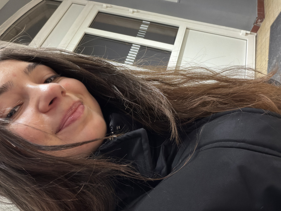 A young woman with brown hair smiles slightly, her face angled towards the viewer. She is wearing a black jacket. The background consists of a white door or wall with rectangular window panes. The lighting appears to be indoors, possibly fluorescent. The angle suggests the photo was taken from a slightly elevated perspective, looking down at the subject.