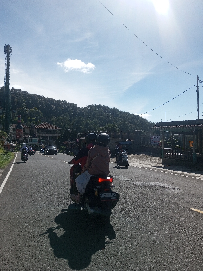 The scene is set in the city of Ka Thaung (Upper), Myanmar, on a bright, sunny day on a paved, two-lane road. The image is taken from behind a dark-colored scooter, which is the primary subject, traveling away from the camera. This scooter carries two helmeted individuals; the driver wears a dark jacket, and the passenger, a light brown long-sleeved top. A light-colored item is draped over the rear seat. The scooter's license plate, clearly visible, displays "F 6807 FU" and the numerical mark "03-24". A distinct shadow of the scooter and its occupants is cast on the asphalt road surface in the foreground, indicating a high sun angle. Ahead of the primary scooter, multiple other motorcycles, each with one or two riders, are also traveling in the same direction. A dark-colored sedan is visible further ahead amidst the motorcycles in the left lane. The road features a white solid line marking the left shoulder and faint yellow lines in the center. To the left of the road, a steep hillside rises, densely covered in dark green foliage and trees. Amongst the trees, several buildings with red-tiled roofs are discernible. A tall, dark lattice communication tower stands prominently on the hillside, and below it, a large, dark, bottle-shaped advertisement with red elements is visible. To the right of the road, utility poles with overhead wires are present. A brown wooden structure with an open side and a tiled roof stands parallel to the road, with a lighter-colored concrete wall behind it. Some signs are affixed to the wall and structures on the right, with "FREE" and "NAC" partially legible on one sign. The sky is a clear blue with sparse white cumulus clouds, and a bright sunflare is visible in the upper right quadrant of the image.