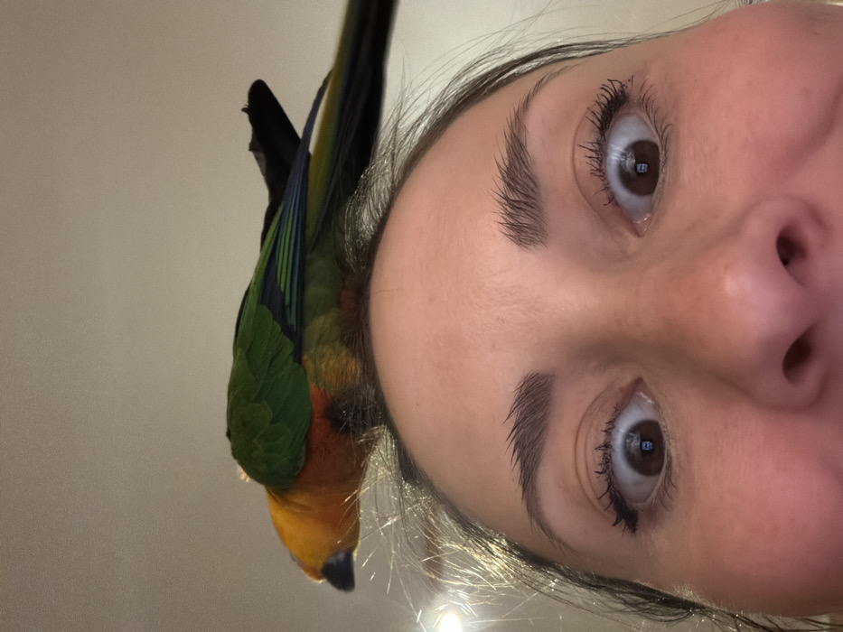 A selfie, tilted, shows a woman with large, expressive eyes looking directly at the camera. A colorful parrot, primarily green, orange, and yellow, is perched on her head. The parrot's tail feathers, black with blue and green accents, point upward. The woman has fair skin, defined eyebrows, and long eyelashes. The background is a soft, neutral tone.