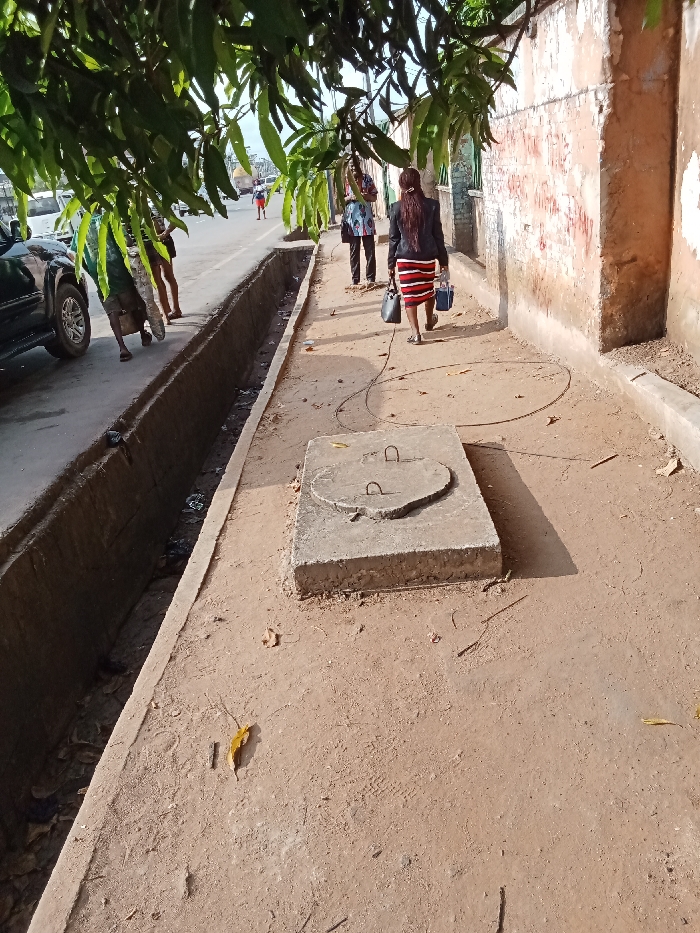 A narrow concrete walkway runs beside a deep, uncovered drainage ditch filled with trash. A concrete manhole cover sits in the middle of the path. People walk along the walkway, a few near the parked vehicles on the street, and one woman in a skirt and jacket walks closer to the wall that lines the path. Trees overhang the walkway, casting shadows.
