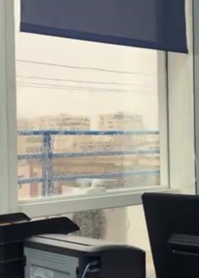 rainy day through the window of what appears to be an office. The window is partially covered by a dark blue roller shade. Outside, there are buildings visible through the rain-streaked windowpane. A blue railing is also visible. Inside the office, there is a printer on a desk along with a computer monitor. The lighting is dim, reflecting the overcast conditions outside. The sound contains a person speaking.