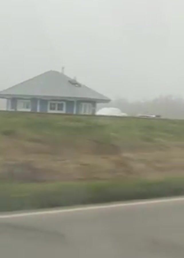 The camera is mounted inside a car moving along a road on a foggy day. The road is asphalt and is flanked by a grassy embankment. A light blue building with a gray roof is visible on the embankment. There is a white vehicle and a dark truck parked behind the building. The embankment also has evenly-spaced white posts.