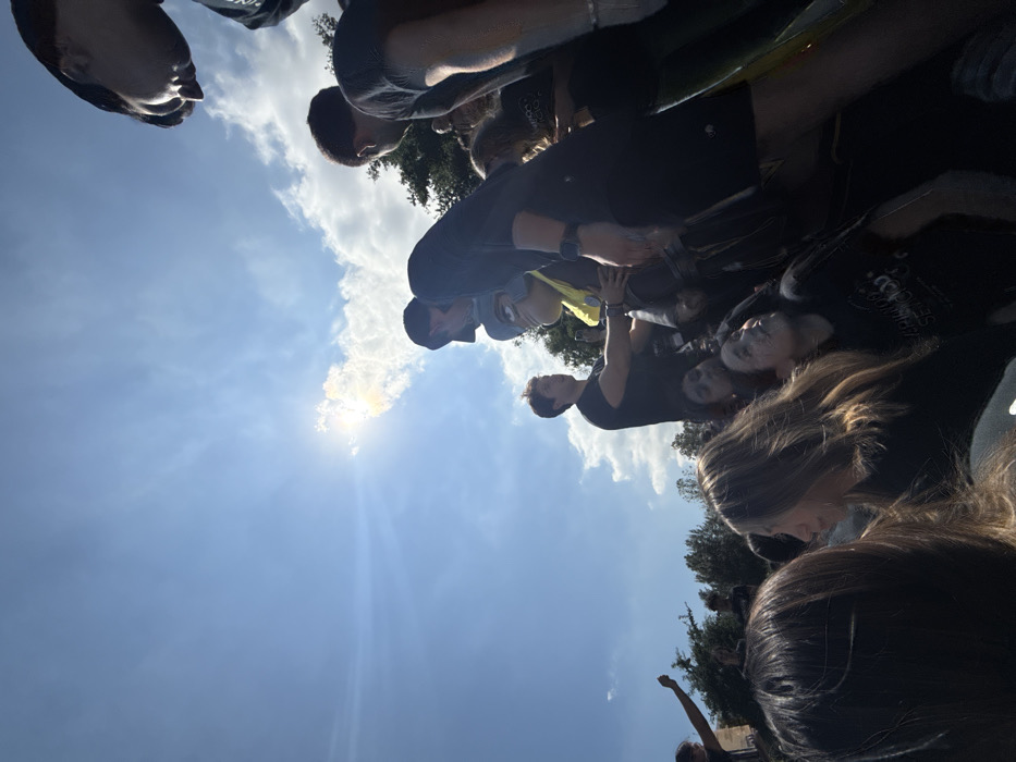 - "The image displays an outdoor gathering on a bright, sunny day under a blue sky with sparse white clouds and a prominent lens flare emanating from the sun in the upper left quadrant" by FM-Yl6102, licensed under CC BY 4.0