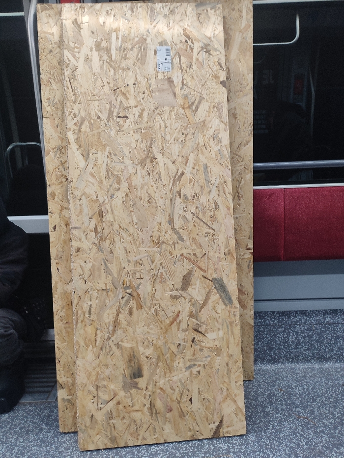 Two sheets of oriented strand board (OSB) stand on end inside a public transportation vehicle. One is slightly in front of the other. A dark-clad person sits to the left. A red cushioned seat with a stainless steel grab bar is in the background. The floor has a speckled gray and white pattern. A white sticker is affixed to the OSB's upper section. The boards have a yellowish-brown hue with visible wood strands.