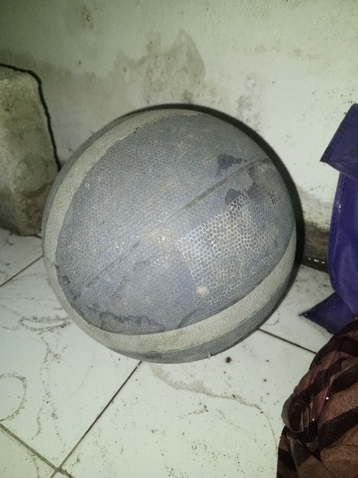 A used, dark grey basketball with two lighter grey circumferential stripes rests on a light-colored, multi-tiled floor. The basketball's surface exhibits significant wear, dust accumulation, and dark stains, with its pebbled texture visible but degraded in areas. The tiled floor beneath the ball is dirty, marked by numerous dark specks, smudges, and indistinct streaking patterns along the grout lines. In the upper left background, a large, irregularly shaped, light-colored block, possibly concrete or stone, is positioned against a light-colored wall. This wall displays widespread dirt, dark splotches, and mildew-like stains. To the upper right, a section of dark blue fabric, potentially a bag or tarp, is visible. In the lower right, a crumpled piece of brown fabric with a dark, patterned design is present. The scene is dimly lit, suggesting an indoor or sheltered outdoor setting within Keo Kouang, Laos. No individuals are present, and no active interactions are depicted.