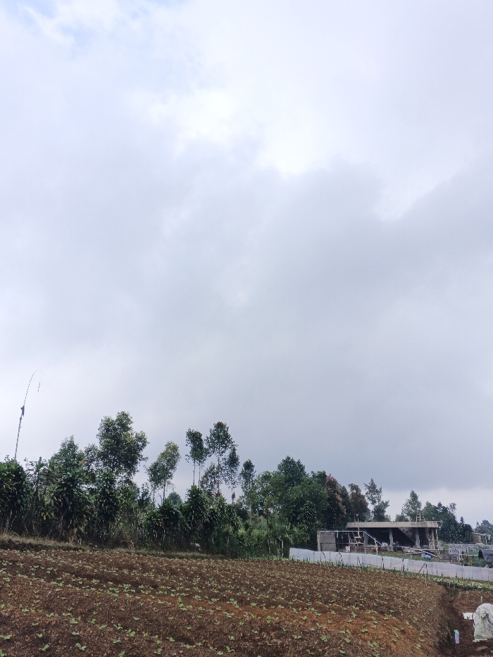 A cloudy sky dominates the view above a landscape of varied greens and browns. In the foreground, a cultivated field with young plants fills the frame. A dense line of trees and bushes creates a midground border. A structure with a partially visible roof and support columns is visible behind the trees. The overcast sky obscures details in the distance.