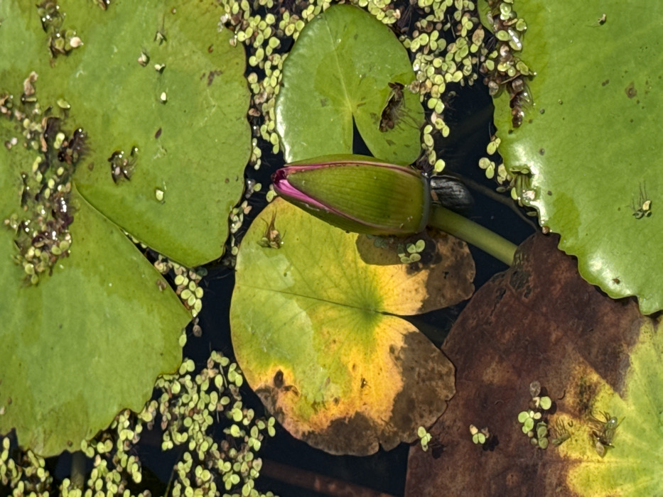 The image displays a close-up, top-down view of an aquatic environment, likely a pond or shallow body of water. A prominent, elongated lotus or water lily bud, primarily green with a magenta-pink upper edge, extends upwards from a green stem submerged in dark water, positioned in the lower-middle section of the frame. Surrounding the bud are multiple large, circular to ovate lotus or water lily leaves, varying in color from vibrant green to yellow and brown, indicating different stages of health or decay. One large leaf on the left exhibits significant yellowing and brown discoloration. The dark water surface is largely covered by numerous small, light green floating aquatic plants, resembling duckweed. Several small, light-colored insects or invertebrates are visible resting on the surfaces of various leaves and on the water itself. A small, dark invertebrate is situated on the stem of the lotus bud just above the waterline. The specific location within the city of Đà Nẵng, Vietnam, cannot be determined from the visual information provided in the image.