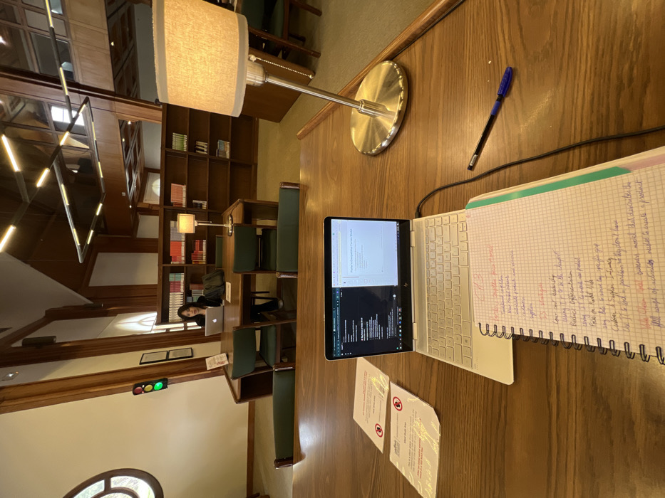 The image depicts an indoor study area within a university library, identifiable as Al Akhawayn University in Ifrane, Morocco, due to its characteristic architectural style featuring exposed wooden beams, high ceilings, and arched windows. In the immediate foreground, a light-colored laptop is open on a polished wooden table, displaying a split screen with a dark-themed application on the left and a document titled "Porter's Competitive Forces Model" on the right. A spiral-bound notebook with grid paper, containing handwritten notes in red and blue ink pertaining to business concepts, lies beneath the laptop. A black pen with a blue cap is positioned to the right of the notebook. Two white papers, one indicating a "Quiet Study Area" and social distancing guidelines with "no food/drink" symbols, are on the left. A modern desk lamp with a beige fabric shade and a polished metallic base stands on the far right. In the midground, a female individual with dark hair and a dark top is seated at a large wooden study table, actively working on a silver laptop. A dark bag rests beside her laptop. A smaller table lamp with a white shade provides localized illumination. The table is surrounded by dark green chairs. Behind this table, a substantial section of wooden bookshelves, well-stocked with books, lines the wall. The background reveals the library's architecture, characterized by white walls, prominent wooden pillars, and high ceilings with exposed wooden beams. A distinctive circular window is visible on the far left. A vertical three-section signal light, with the green light illuminated, is mounted on a wooden pillar. Modern rectangular lighting fixtures are suspended from the ceiling. The floor appears carpeted, and the overall environment is brightly lit, suggesting a focused academic setting.
