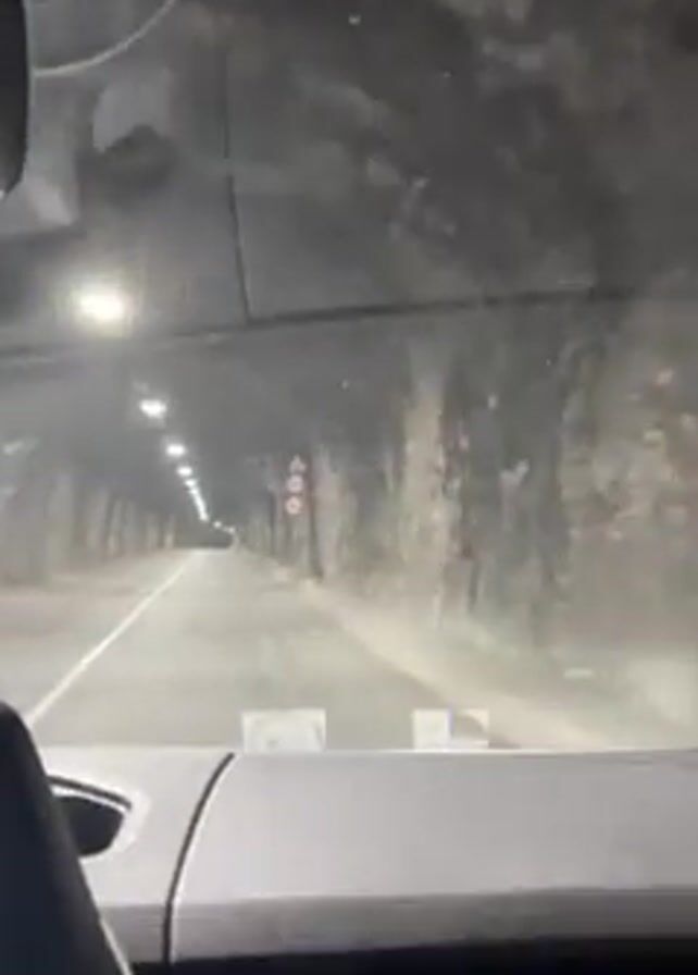 first-person perspective from inside a car driving through a tunnel. The tunnel walls are rough, made of rock, and lit by evenly spaced lights along the ceiling. There is a white lane marker on the left side of the road. A speed limit sign is visible. The car is moving forward at a steady pace. The dashboard is visible at the bottom of the frame. The environment is dim due to being inside the tunnel.
