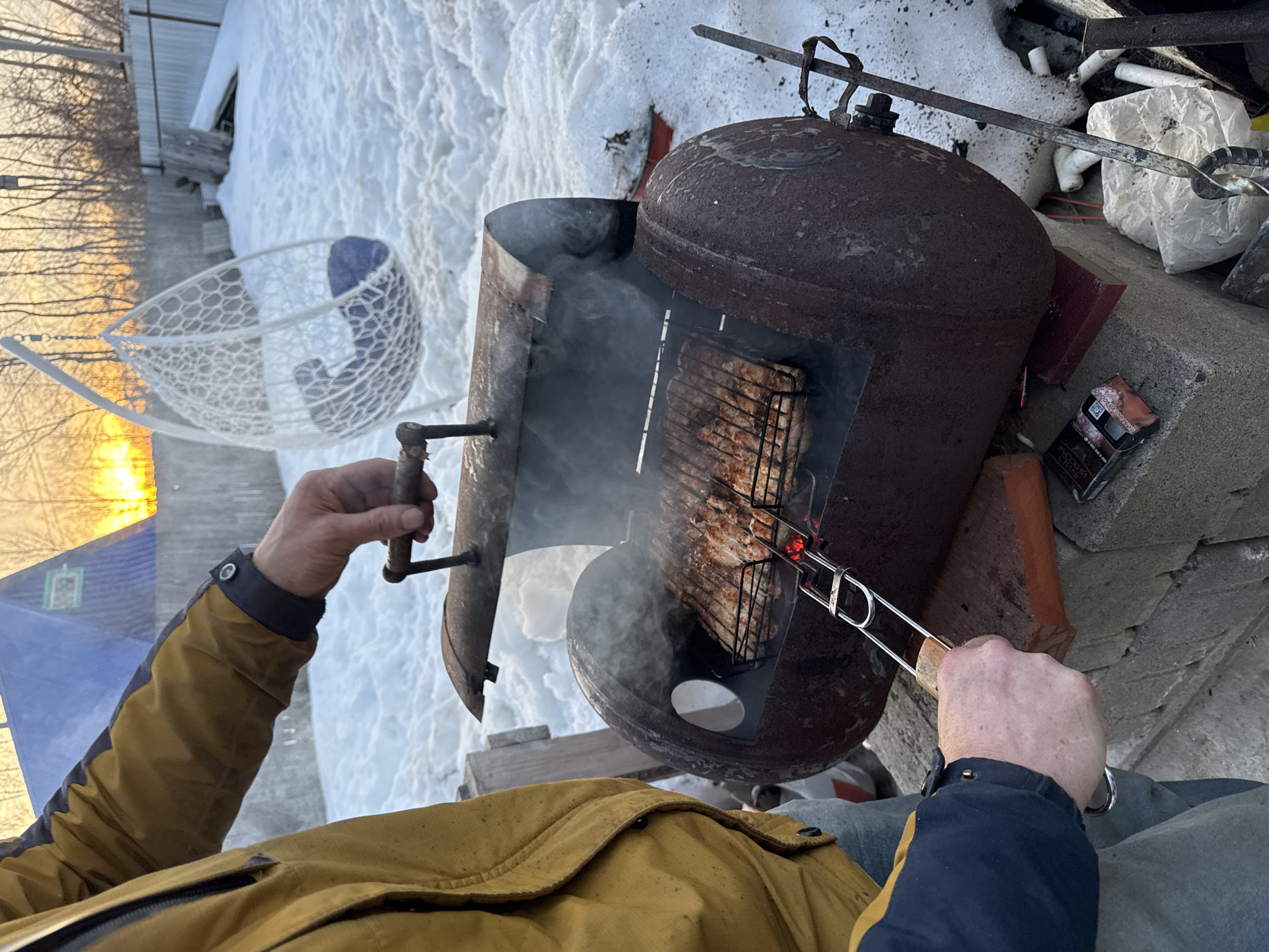 An individual is depicted outdoors, grilling meat on a rusty, repurposed gas cylinder barbecue in a snowy residential or dacha area of Chaikovsky, Russia, during sunset. The person's left arm, clad in a mustard-yellow jacket with a dark blue cuff, is visible from the bicep down, holding metal tongs with a wooden handle to adjust the grill grate. Their right hand, ungloved, holds the wooden handle of the grill's hinged lid, which is currently open, revealing smoking meat (possibly pork or chicken pieces) cooking over glowing embers on a grate. The grill rests on concrete blocks and a red brick. Patches of melting snow cover the ground, revealing underlying debris including a black cigarette pack with Russian text ("ОРИГИНАЛЬНЫЙ") and a white plastic bag. In the background, a white woven egg-shaped hanging chair with a dark blue cushion is suspended over the snow. Beyond this, bare trees, a wooden fence, and a distant house with a blue roof are visible. The setting sun casts an orange glow low on the horizon.