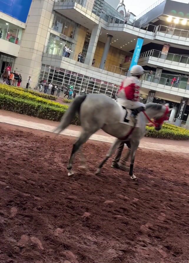 horse racing track. Horses with jockeys are parading on the dirt track. The horses are different colors, including grey, brown, and black. The jockeys are wearing colorful outfits. There is a large building in the background with signs and advertisements. People can be seen watching from the building. The sky is overcast. The ground is muddy. The video appears to be shot from near the track level.