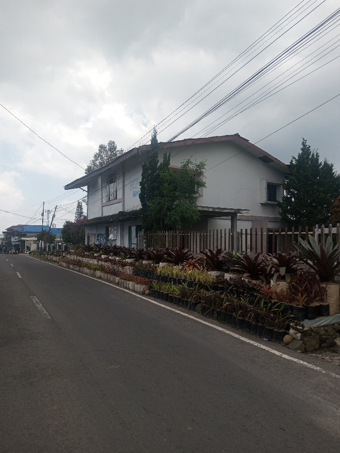 The image depicts a static street scene in Kalchini, India, under an overcast sky. A two-story, light-colored building with a pitched brown-tiled roof dominates the right side of the frame. The building features several windows and a partially visible blue inscription on its upper facade, possibly "T.I.J. BOYS." Tall, narrow evergreen trees flank the building, and a wooden slat fence runs along its property line. Parallel to the building, a long, continuous array of potted plants, primarily bromeliads and various foliage plants, are arranged along the edge of a paved asphalt road. These plants are contained in a mix of black plastic bags, white cylindrical pots, and larger planters. The road itself shows a faded white dashed line for lane division and a solid white line at its edge. Further down the road on the left, additional buildings are visible, including one with a blue roof structure. Multiple black electrical wires stretch across the upper portion of the frame, originating from utility poles partially visible on the left. No individuals or specific actions are clearly discernible in the immediate foreground or midground.